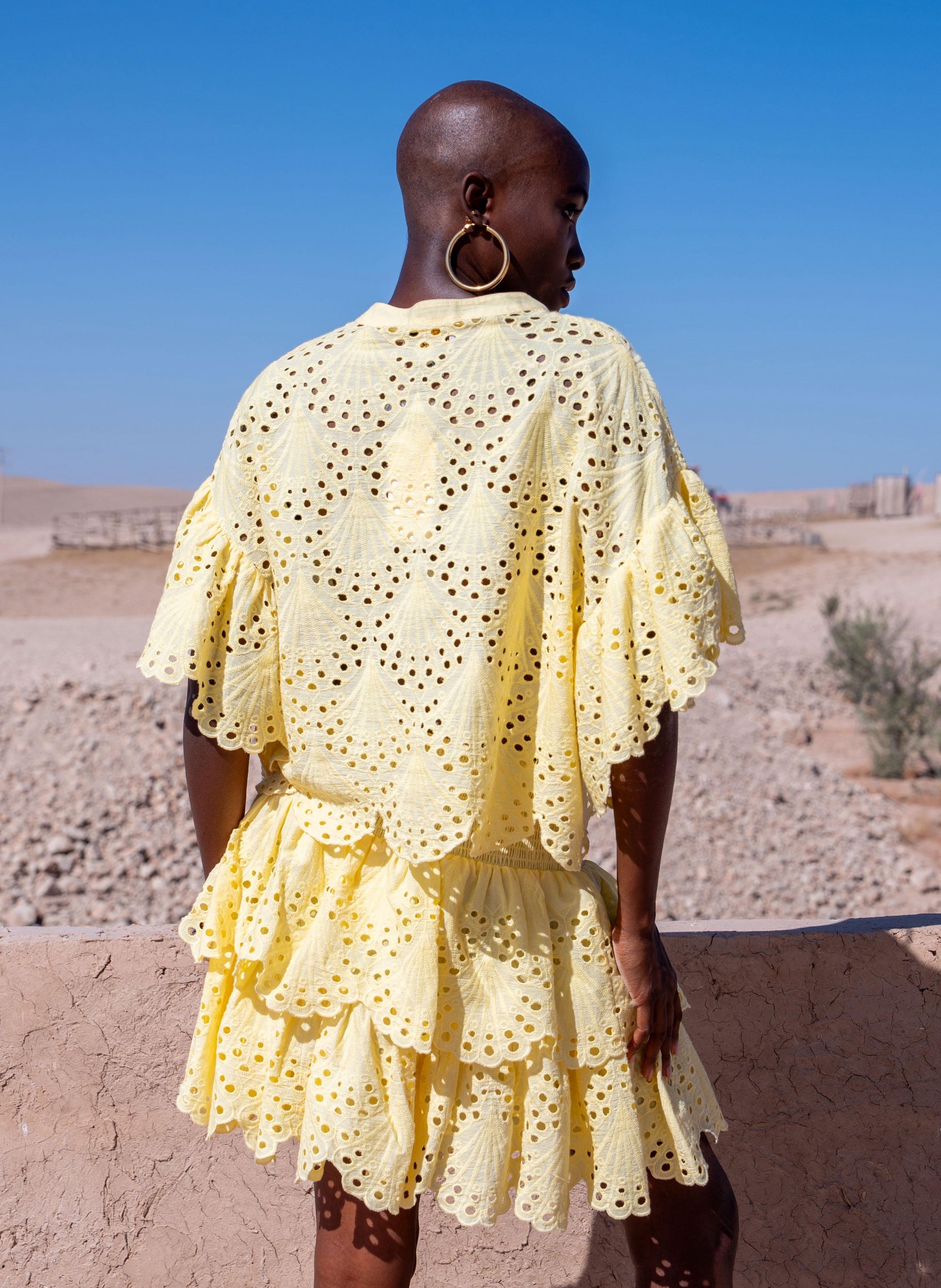 Broderie top van Bianca (Gold & Silver) met knoopsluiting en speelse mouwen dankzij de lange ruches. Combineer met de bijpassende rok voor dé ultieme zomer look!