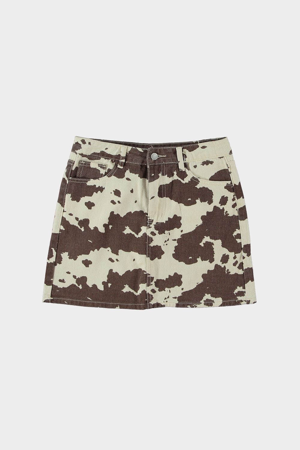 Rokje gemaakt van denim stof met de trending koeienprint met zilverkleurige knoopsluiting.