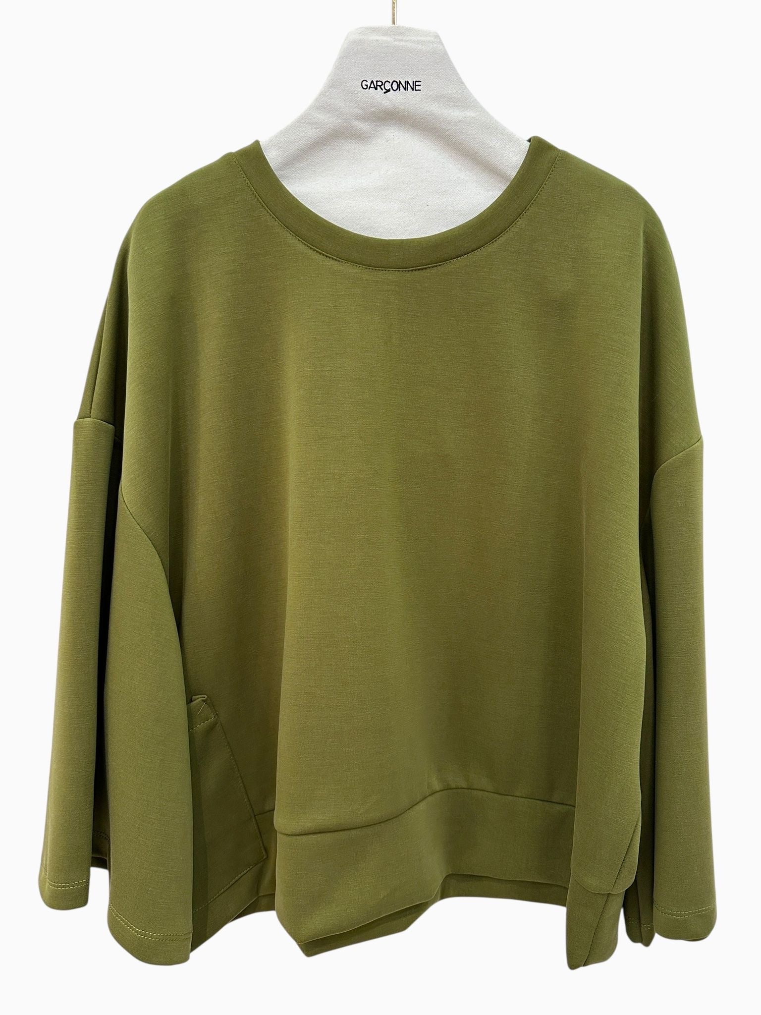Losvallende top met ronde hals, opgestikte zak en halve mouwen. Combineer de top met de bijpassende broek voor een complete look.