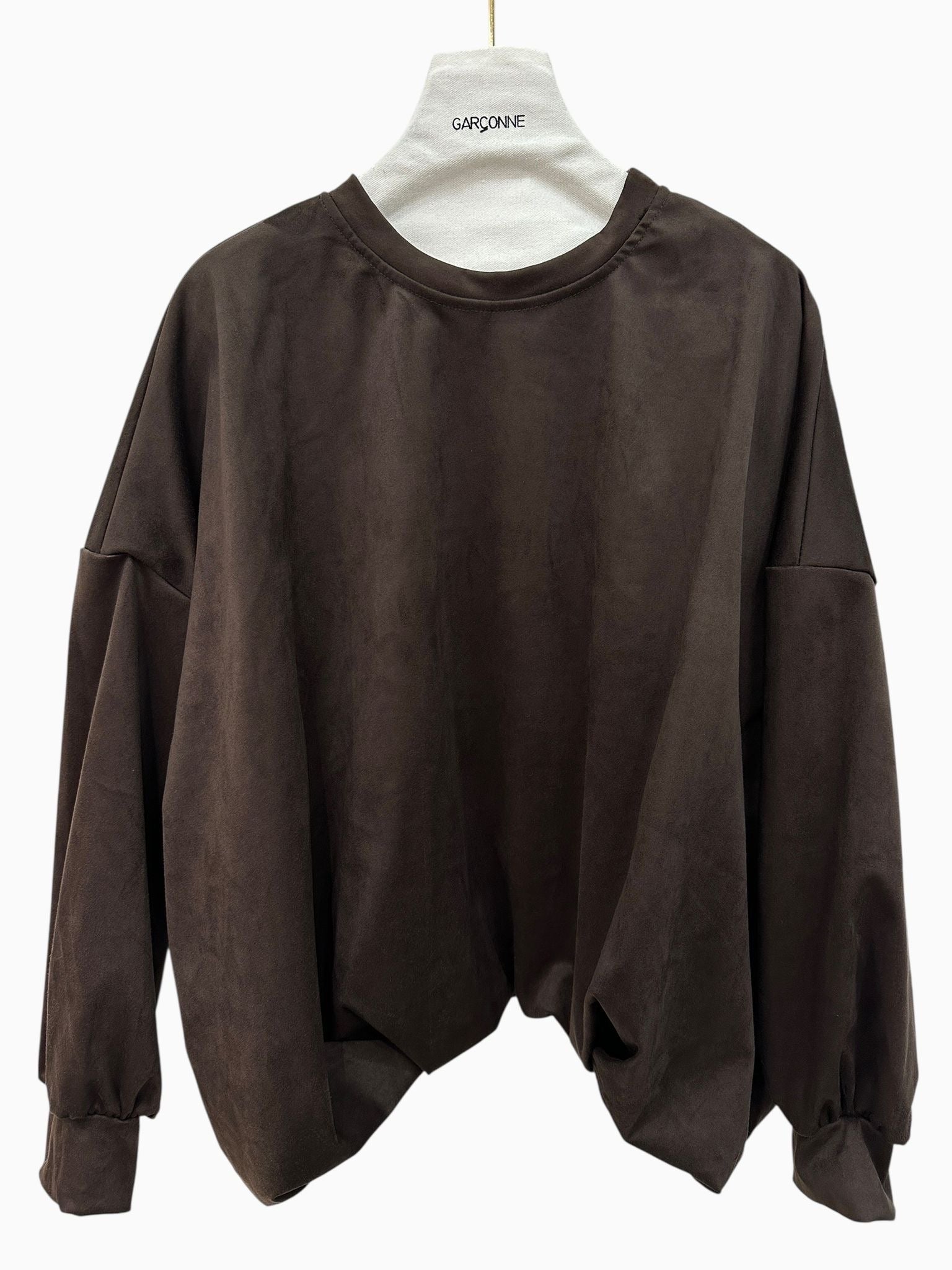 Ruim vallende top van suèdine met poffende zoom. De top is gevoerd en verkrijgbaar in 2 kleuren.