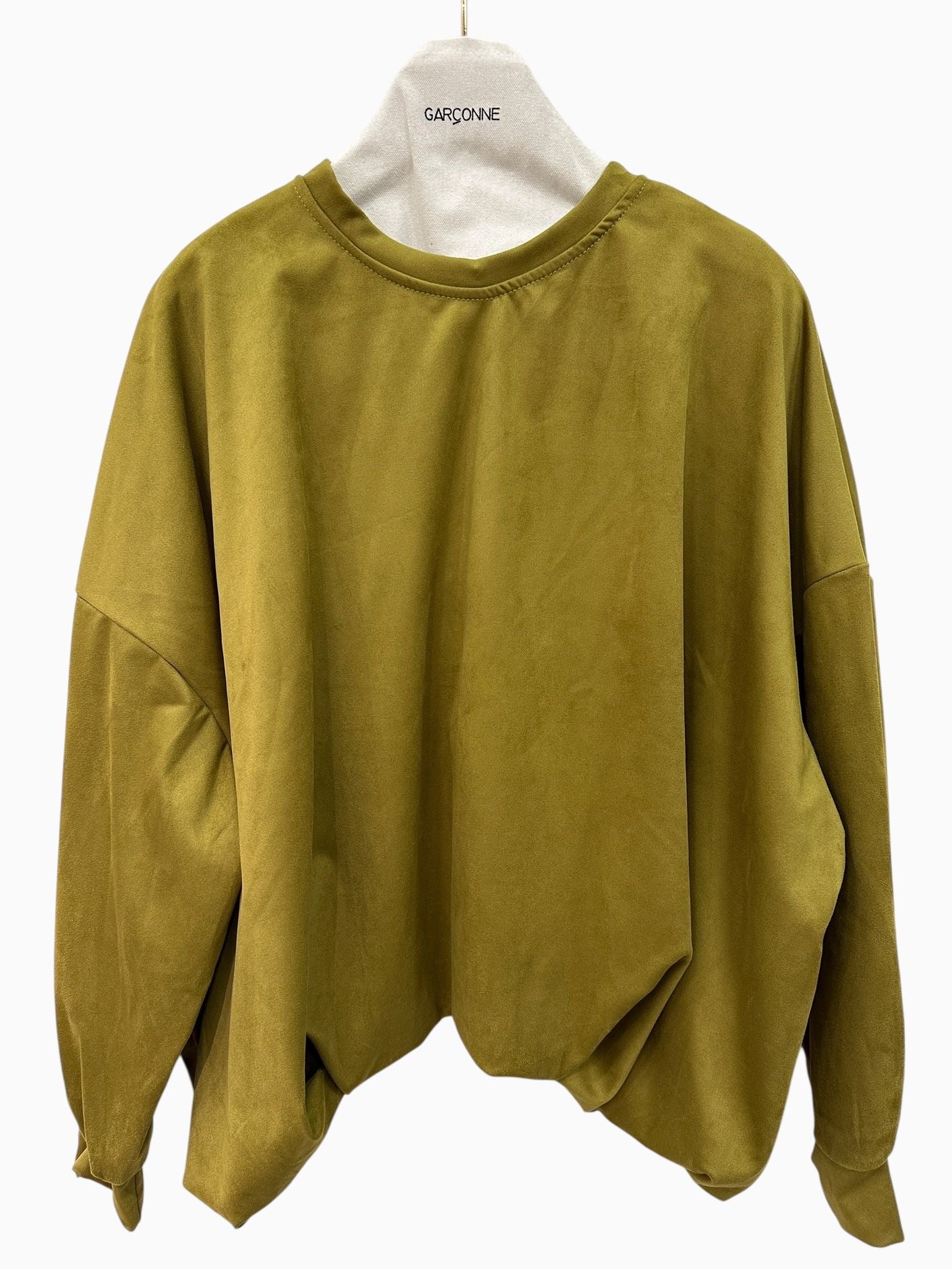 Ruim vallende top van suèdine met poffende zoom. De top is gevoerd en verkrijgbaar in 2 kleuren.