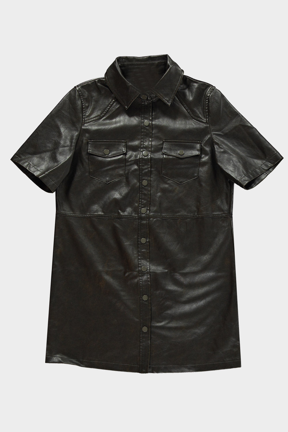 Doorknoop jurkje van vegan leather met kraag en korte mouw. Combineer met gave boots en jouw look is helemaal af!