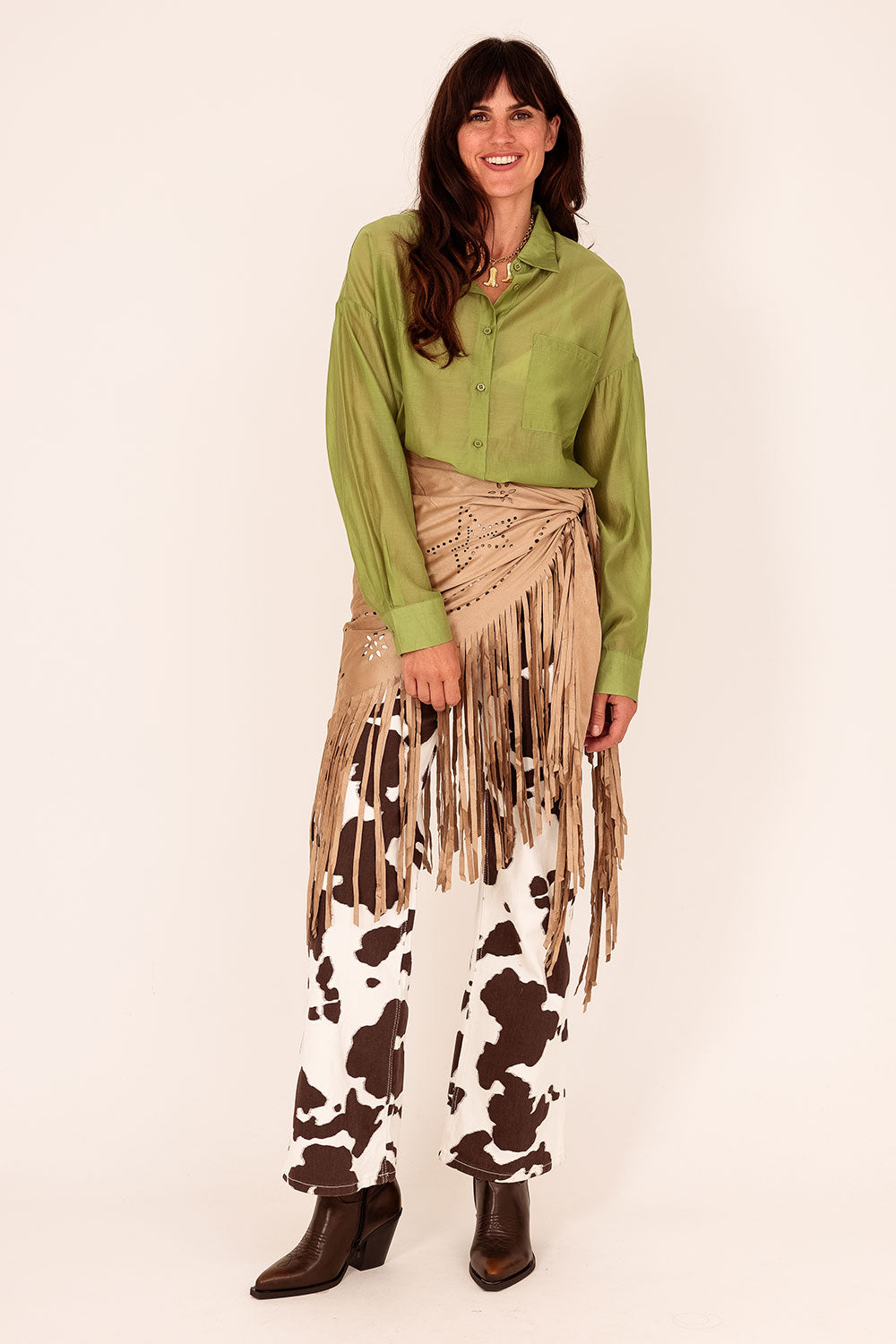 Trendy sjaal met motief en franjes. Op verschillende manieren te stylen. Verkrijgbaar in 2 kleuren.